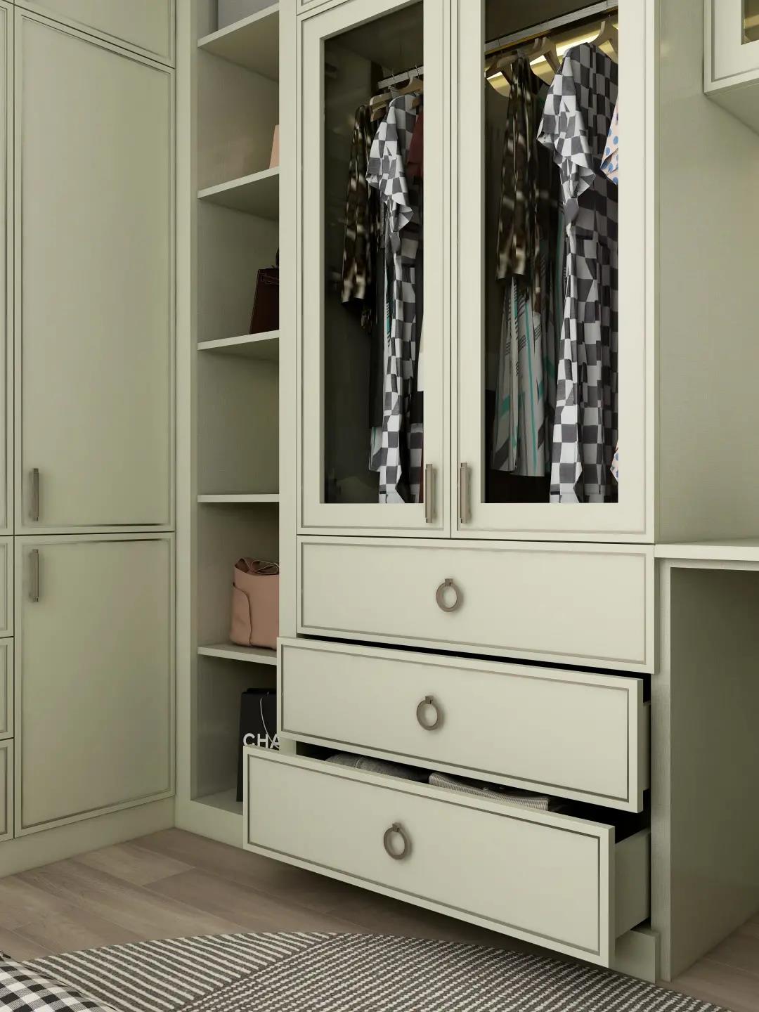 主卧衣帽间的衣柜结合妆台一体设计,
